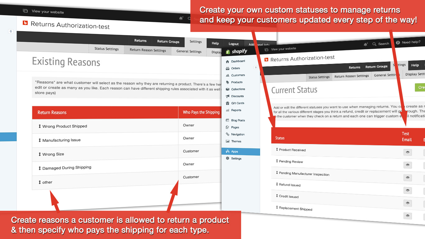 A full-featured returns manager app that allows you to set return rules for different products in your store. Customers can submit Return, Exchange or Credit requests themselves through your website. They can also manage and check on returns themselves and you have a full backend to set custom statuses with custom emails and sooo much more!