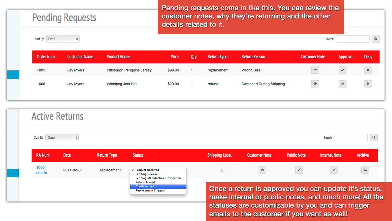 You can set the app to send custom emails to a customer when their return is approved or denied and as well when it has a status change. It handles a number of merge fields so you can customize the email with the things like First name, last name, product name, RA#, Order#, return type etc...