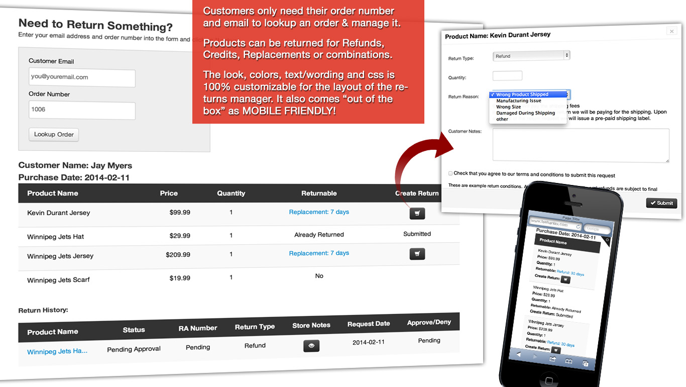 The returns manager interface that the customers use to submit a return is clean and effective. It's also 100% responsive so it will work on mobile themes as well! It comes with a good "out of the box" look but we've built everything to be completely customizable so you can give it a look and feel all your own to match your store's branding.