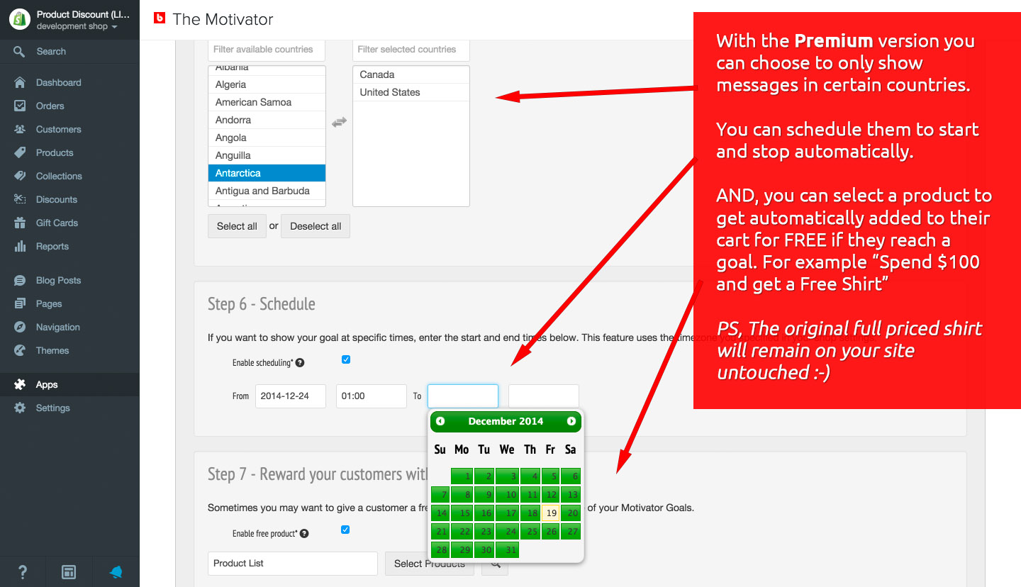 Before you create a motivator with the Standard version you need some type of "goal" already setup. Free shipping is by far the most popular. So let's say you have free shipping in your store for all orders over $100. Once you have that setup in your store you great a matching goal in the Motivator app to encourage customers to get to that goal.