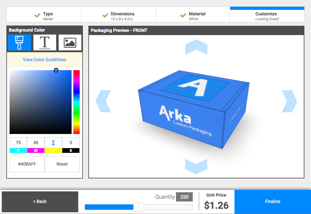 The design process is seamlessly simple. I love the simplicity and the upfront estimated prices. BUT... the shipping cost are terrible, they are flat rated per box ordered (although the boxes are super lightweight). I spoke to a rep who said they are working on making the prices actually make sense. For example. I order 10 mailer boxes, total with taxes.. $17, with taxes, instantly became $93. Even when i added 250 boxes, i couldn't believe the totals!