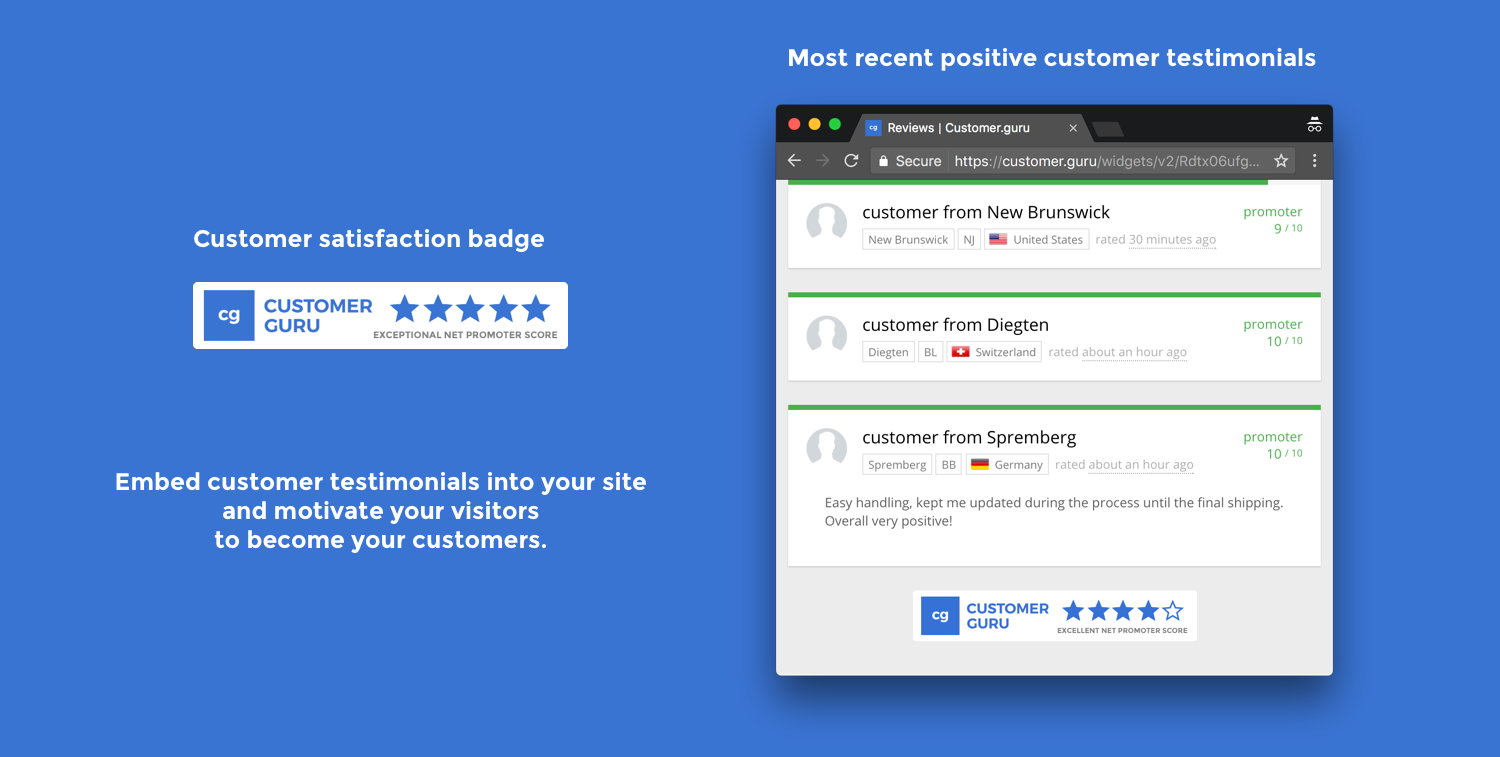 Embed one of our widgets directly into your site and show your potential customers how authentically great you are: Increase their confidence and increase your conversion rates.