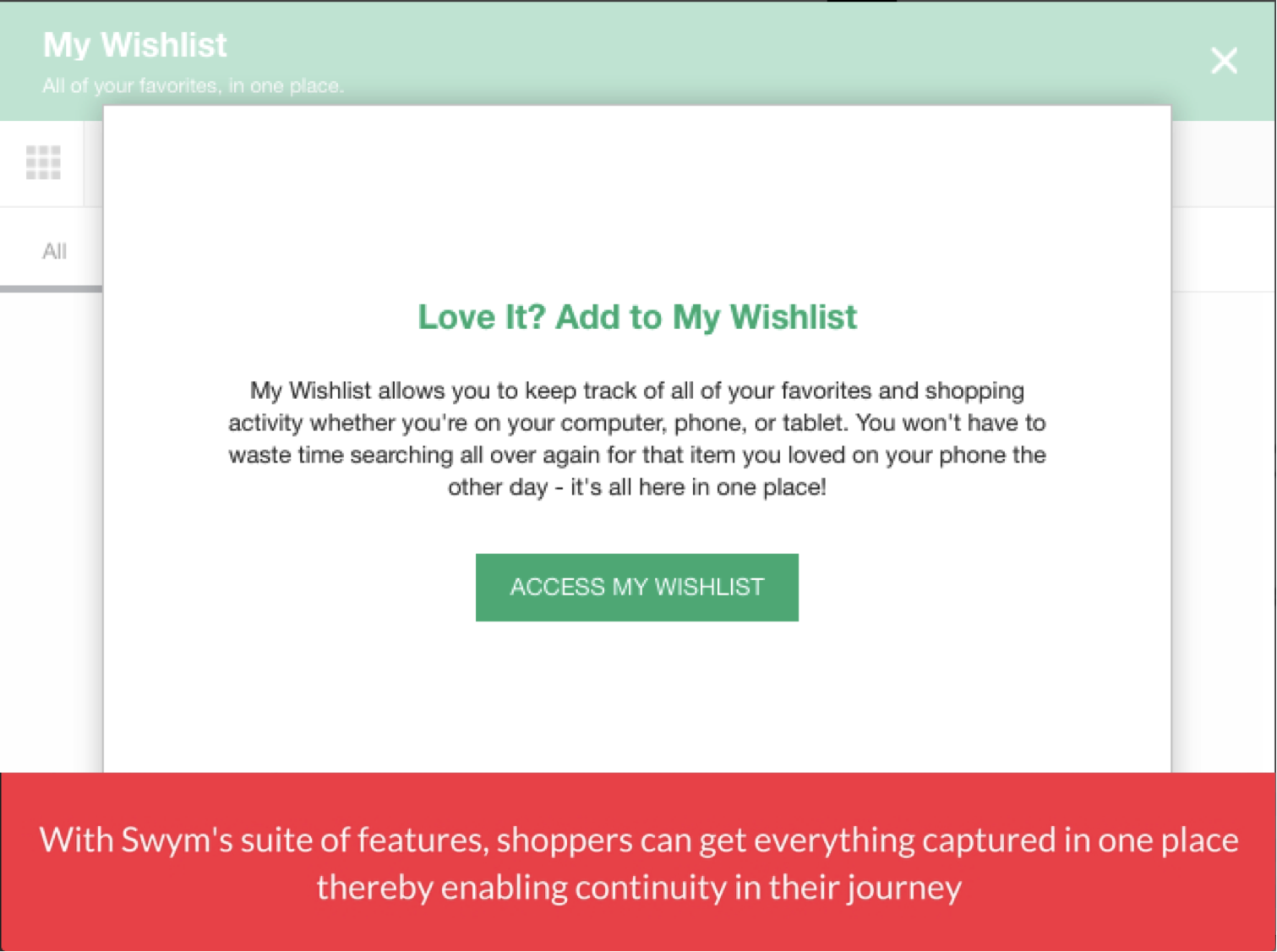 Swym Wishlist+ makes it easier for these shoppers to ‘Pick up where they left off’. With Wishlist+, the shopper's activity is intuitively organized for them via the UI module, is always available and connected to all their devices.